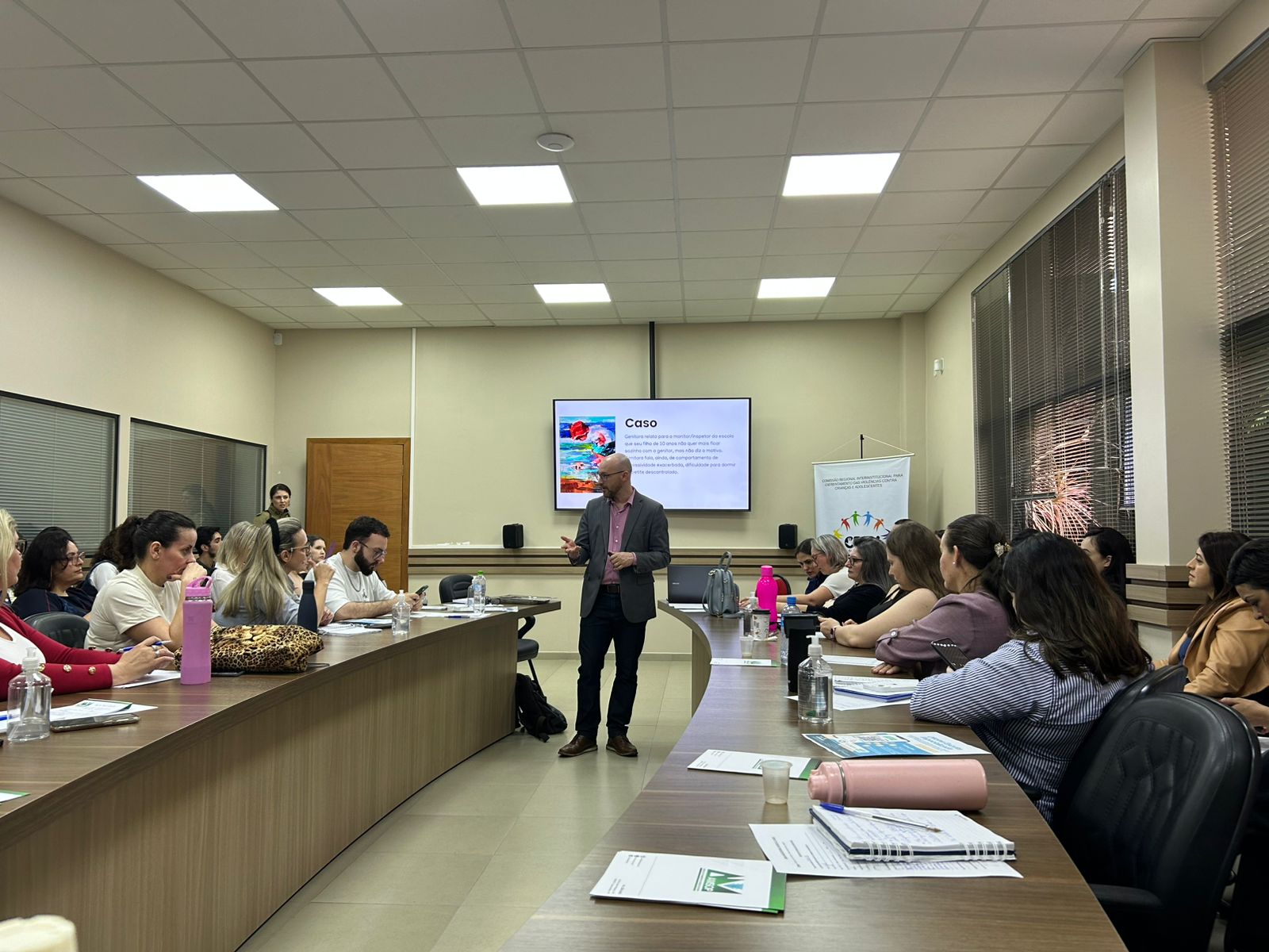 Durante os dois dias de formação, as atividades foram conduzidas pelo psicólogo Rudinei Luiz Beltrame, que abordou aspectos fundamentais para o trabalho técnico e ético com crianças e adolescentes em situação de violência.